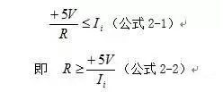 該排阻公共端接電源,即上拉電阻形式,作用是增強FPGA芯片I/O口(以下簡稱I/O口)的驅動能力,實際上就是增加I/O輸出高電平時輸出電流的大小。當I/O輸出高電平時,+5V電源經排阻與IN1~4相連,相當于為I/O提供一個額外的電流輸出源,從而提高驅動能力。當I/O輸出低電平時,可將I/O近似看做接地,而IN1~4因與I/O由導線直接相連,因此直接接受了I/O的低電平輸出信號。此時,+5V電源經排阻R、I/O內部電路(電阻近似為零)后接地,因此該路的電流不能大于I/O的拉電流(Ii)最大值,有公式2-1: